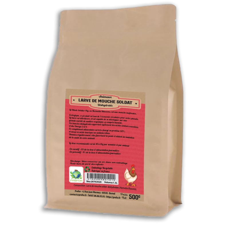 Les larves de mouches sont plus riches en protéines que les vers de farine, autre type d’insecte souvent proposé aux gallinacés. Elles contiennent également des acides aminés et des omégas 3 et 6.