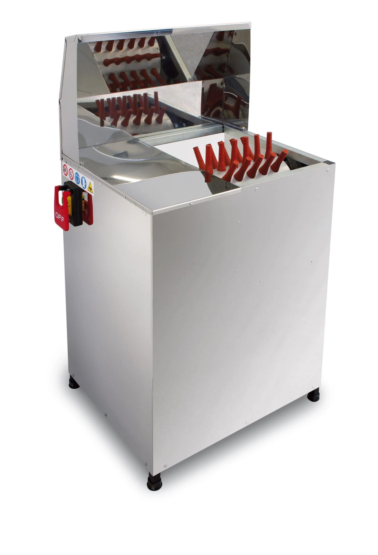 Plumeuse Piumina composée de 54 doigts et permettant de plumer jusqu’à 80 sujets par heure. Plumeuse de qualité professionnelle.