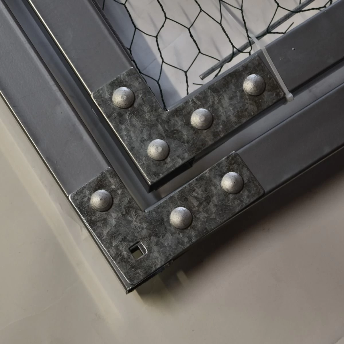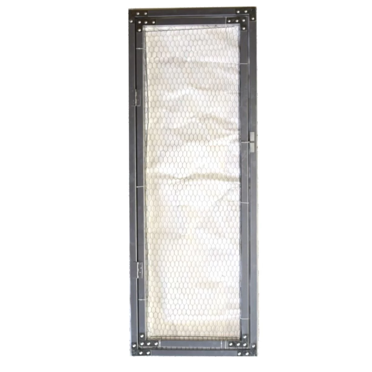 La porte, fabriquée en acier galvanisé et avec un panneau intérieur complètement grillagé, est livrée accompagnée de son cadre extérieur.