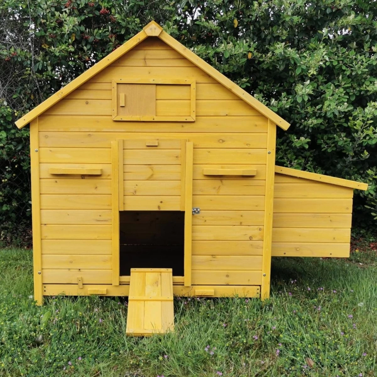Les lignes simples de cette maisonnette à poules évoquent l’idée que l’on se fait d’une ferme traditionnelle. Posez-là dans un espace herbeux entouré d’arbustes et vous aurez l’impression d’être au milieu des champs même si vous habitez en zone urbaine.