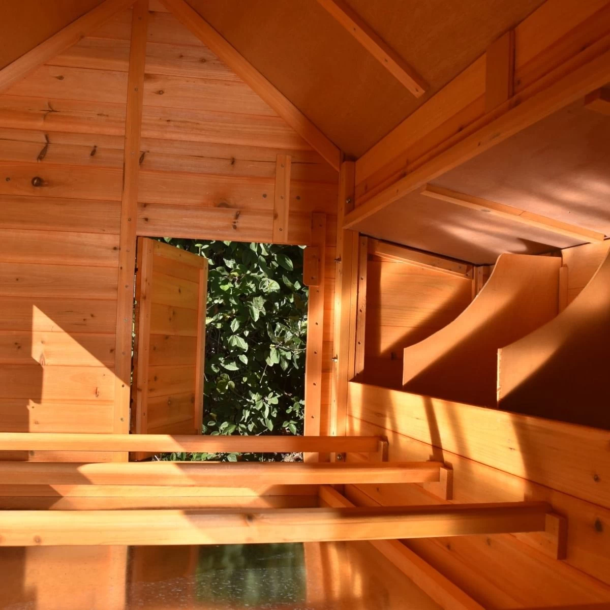 Vos oiseaux se rendront chez eux à l’aide d’une rampe d’accès et se poseront confortablement dans leur intérieur spacieux sur un des quatre perchoirs. Ils se relaieront ensuite dans l’un des quatre compartiments de ponte du pondoir pour pondre.