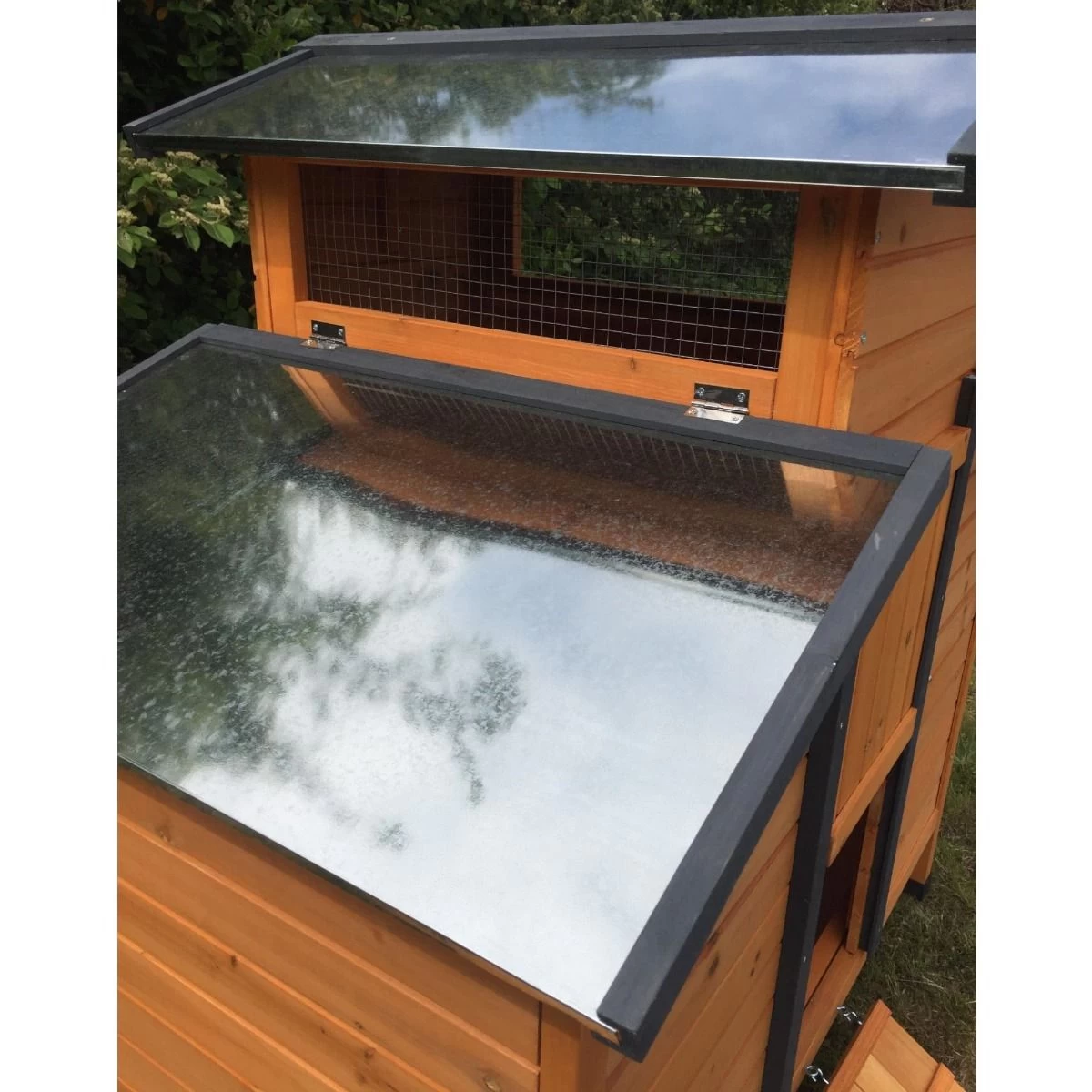 Le poulailler Farmer affiche un style original avec son toit à débords en trois parties. Recouvert de tôle en métal galvanisé, un jeu de contrastes avec le bois apparent des façades rend l’ensemble très agréable à l’œil.
