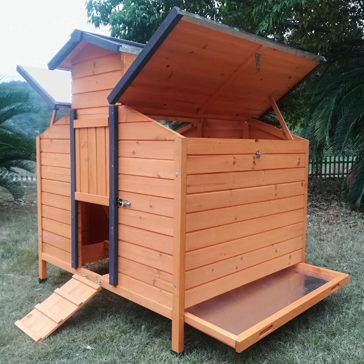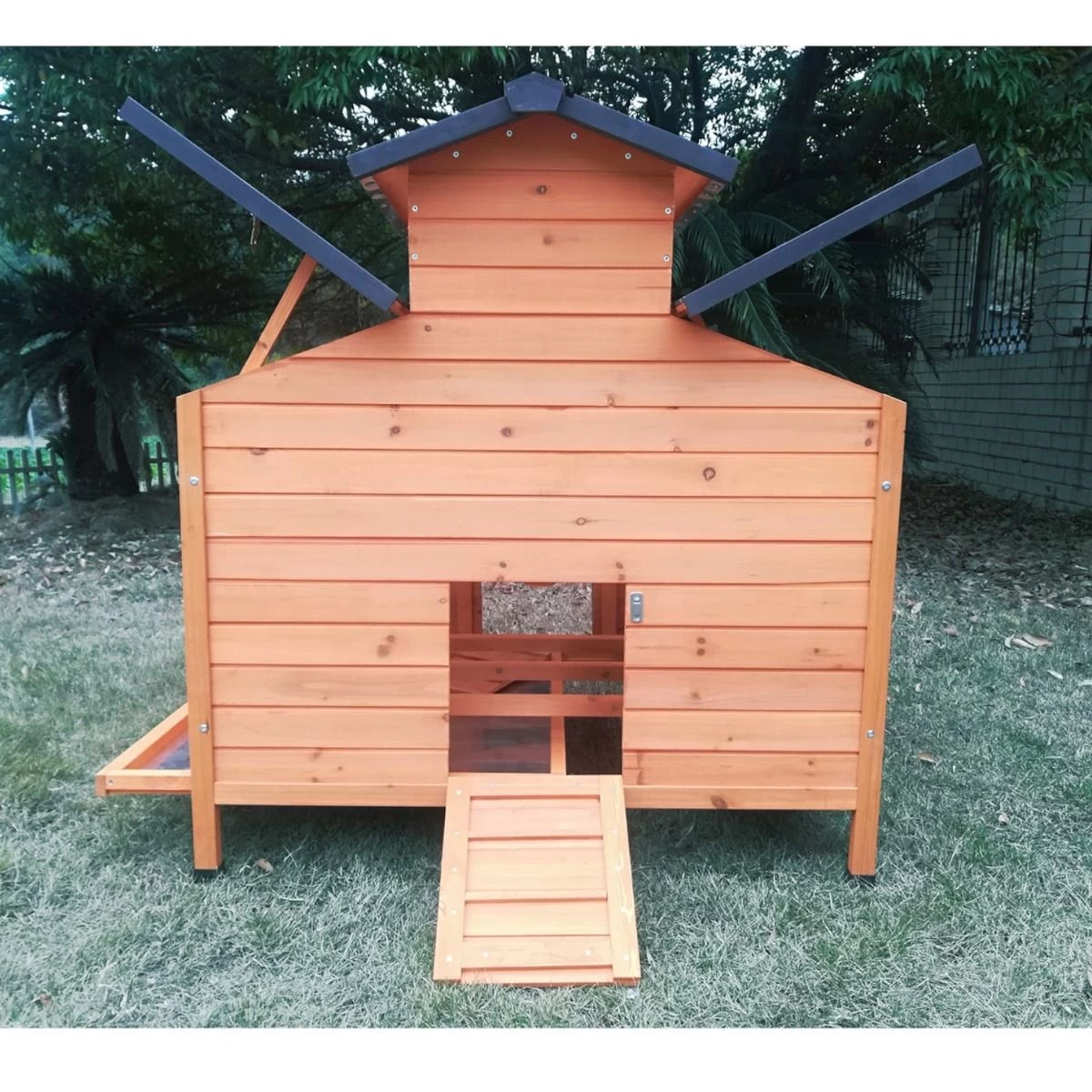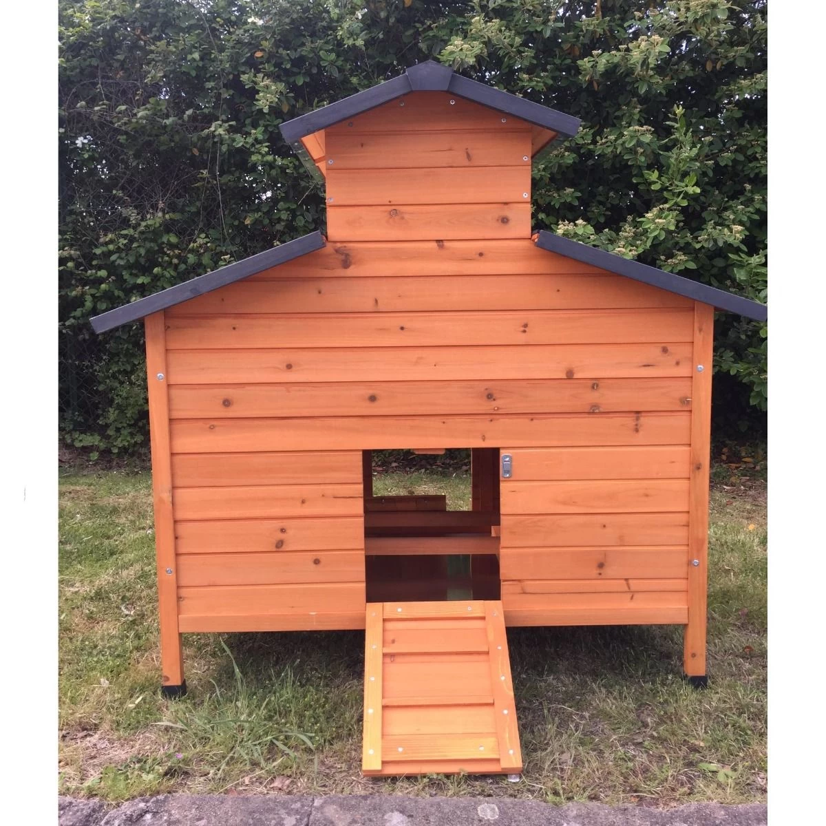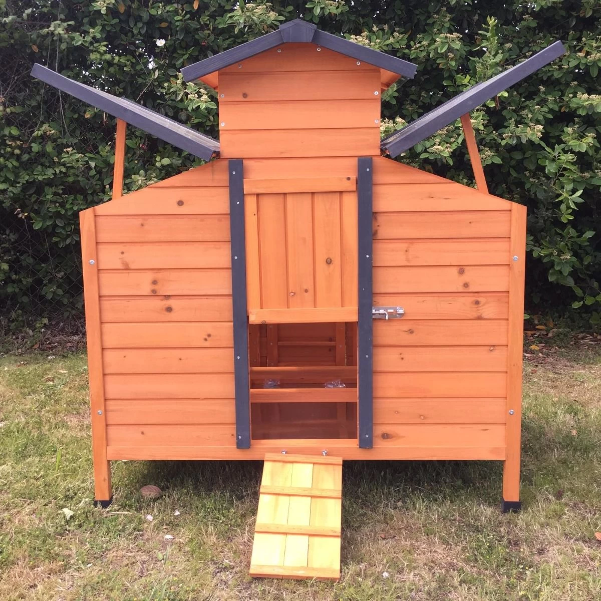 L’accès à l’intérieur se fait par une rampe munie de barreaux pour que vos bêtes ne glissent pas. Elles trouveront dans la partie nuit deux perchoirs ainsi qu’un pondoir avec deux zones de nidification.