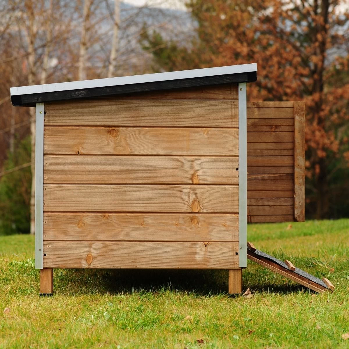 Sa structure se compose de panneaux de bois épais de 10 à 11 mm garantissant une protection efficace de vos animaux contre les intempéries.
