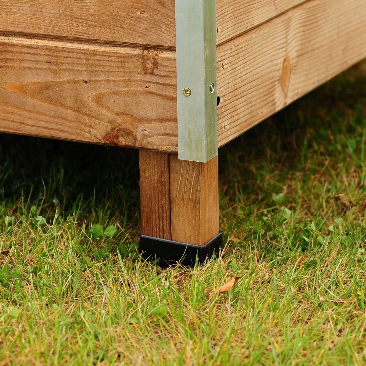 Soulevée du sol par ses quatre pieds, la plateforme s’en trouve mieux isolée. Les extrémités des pieds sont équipées de capuchons de plastique qui empêchent toute infiltration dans le bois.