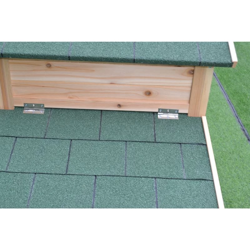 Toute la toiture du poulailler Java est recouverte de shingle, bardeau bitumé et gravillonné étanche qui ne laissera pas passer l’eau.