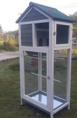 Elle se compose d’un enclos grillagé aux dimensions importantes et d’une partie nuit placée en hauteur. L’ensemble offrira un bel espace de vie à vos oiseaux.